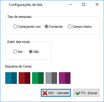 Para alterar o tipo de consulta pressione a tecla F10: Em Configurações da Tela poderá alterar o Tipo da pesquisa: Começando com, Contendo ou Campo inteiro. Poderá alterar o tipo de funcionamento do terminal de acordo com a necessidade:
