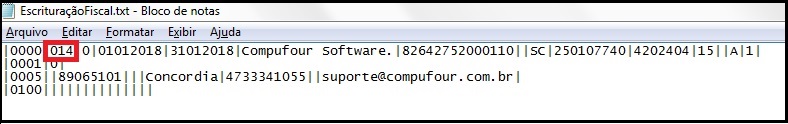 Na primeira linha, o campo da versão estará como: |0000|014|0|;