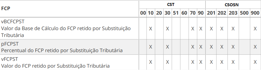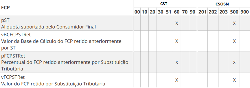 - Para que as informações de vBCFCPST, pFCPST e vFCPST sejam apresentadas, o CST e o CSOSN deve ser algum da relação abaixo: (OPTANTES DO SIMPLES)