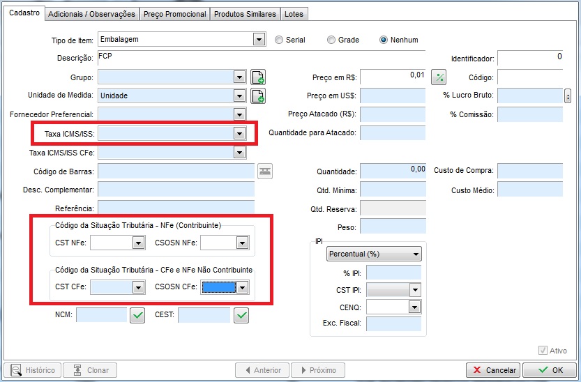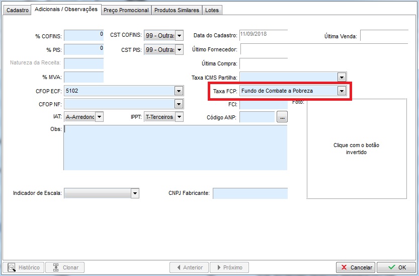 - Ainda no cadastro do produto, clique na aba Adicionais/Observações e preencha o campo Taxa FCP com a opção chamada: Fundo de Combate a Pobreza;