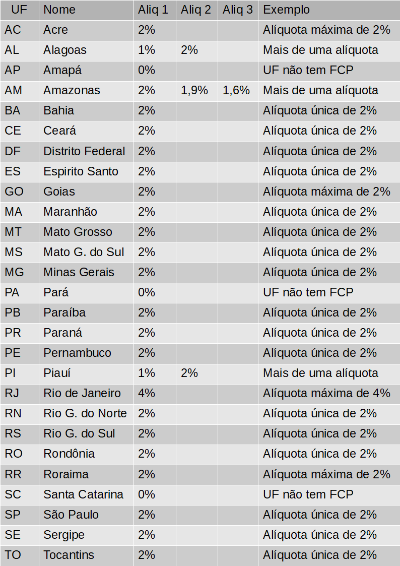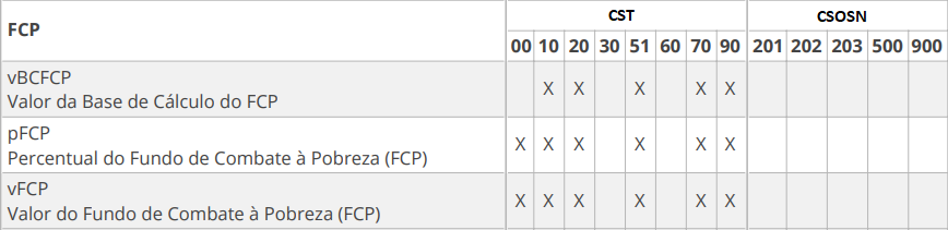 O FCP é um Fundo de Combate à Pobreza, destinado a minimizar o impacto das desigualdades sociais entre os Estados brasileiros adicionando uma alíquota que varia de 1% a 4% nas operações com determinados produtos (definidos na legislação de cada estado). Na versão 3.10 da NFe não existia separação entre a alíquota do ICMS e a do FCP, mas agora, as informações referentes ao valor da base de cálculo e valor em reais são preenchidas em campos distintos.