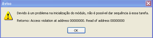Access violation é uma mensagem genérica que pode ser apresentada durante a abertura, impressão ou em diversas outras situações de utilização do sistema. Na maior parte dos casos é devido algum erro de permissão que não permite criar os arquivos de instalação do sistema corretamente. Nem sempre as mensagens relacionadas ao access violation poderão ser corrigidas conosco, em alguns casos onde persiste a mensagem após todos os passos é necessário o teste em outro computador ou até mesmo a formatação do sistema operacional.