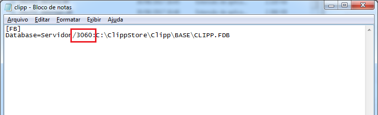 7. Dentro deste arquivo será apresentado um caminho, logo depois do nome do computador acrescente /3060 (igual ao exemplo abaixo), depois de alterar salve o arquivo: