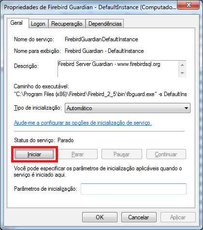 Clique duas vezes sobre ele, logo abaixo terá o botão de parar, clique neste botão e depois em OK. Faça o mesmo procedimento com o Firebird Server, caso o mesmo não tiver iniciado: