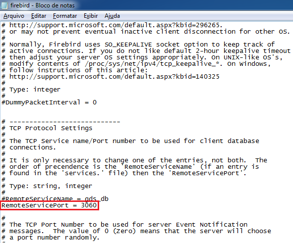 3. Abra o arquivo Firebird.conf com um bloco de notas, localize a linha que corresponde a RemoteServicePort, por padrão ela vem com a porta 3050: