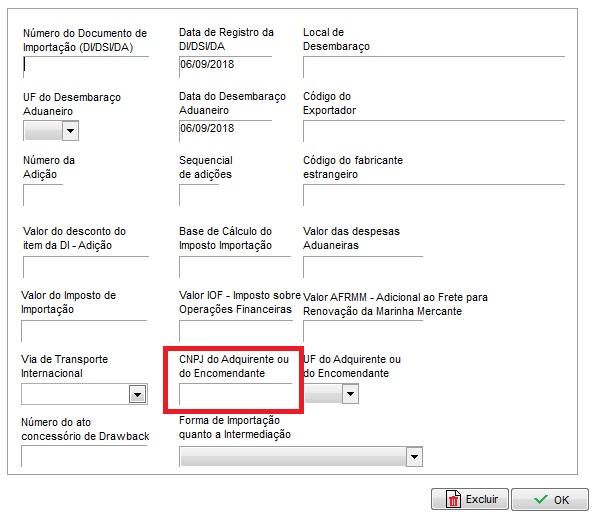 4. Localize o campo que corresponde a CNPJ do Adquirente ou do Encomendante e preencha esse campo com a informação correta (Essa informação consta na sua Declaração de Importação).
