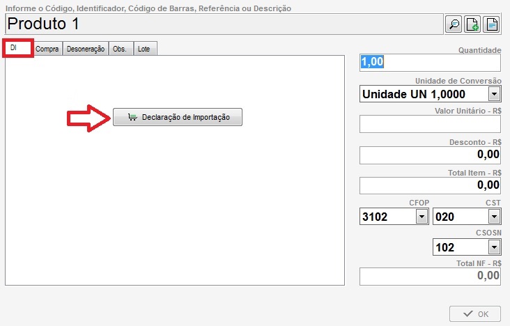 3. Na Aba DI clique em Declaração de Importação.