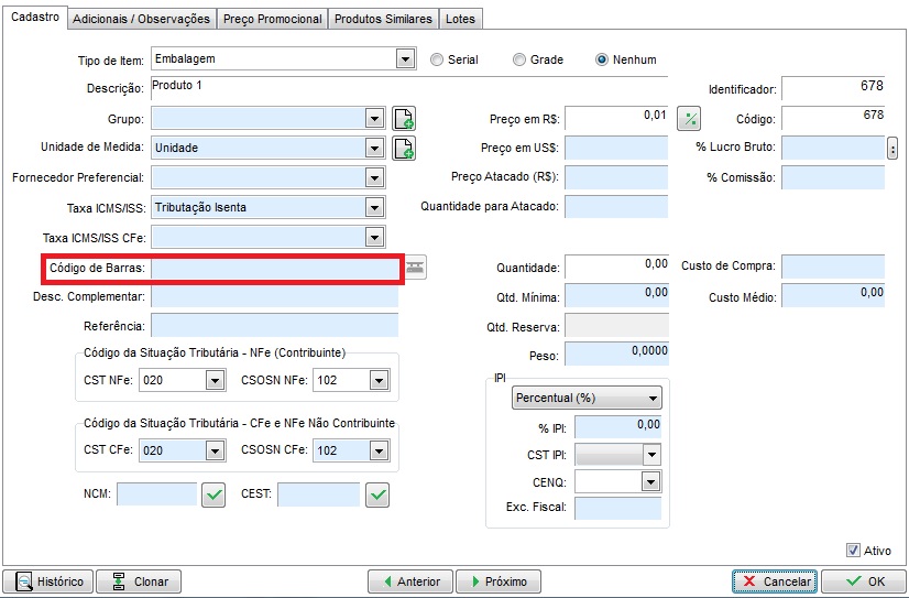 3. No campo correspondente ao Código de Barras, altere o mesmo para um dos padrões: GTIN-8, GTIN-12, GTIN-13 ou então deixe sem nenhum Código.
