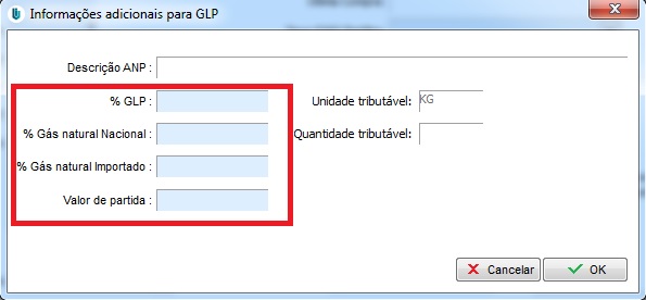 OBS: Caso utilize o código ANP 210203001, mantenha os campos de porcentagem e o valor de partida preenchidos.