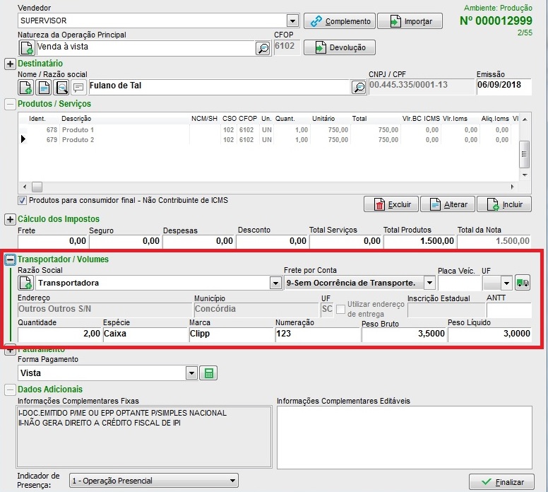 - Posteriormente, enquanto realiza o preenchimento da nota de venda é necessário informar os dados da transportadora e de volumes: