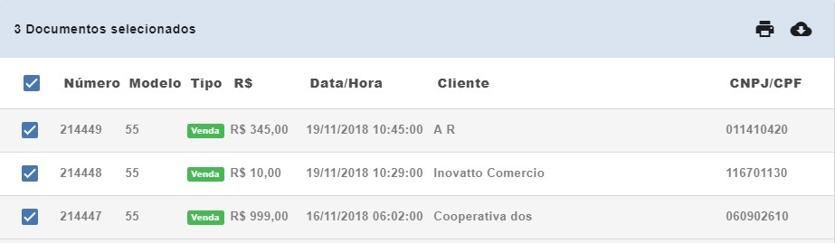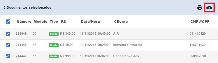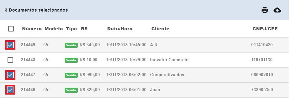 É possível realizar a seleção dos documentos eletrônicos armazenados, após realizar o filtro desejado, selecione os documentos que deseja realizar o download marcando a caixa que se encontra ao lado esquerdo do documento eletrônico.