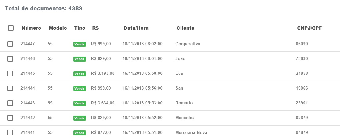 Será exibida a tela com os documentos fiscais armazenados, aqui, poderá visualizar a relação dos documentos fiscais já armazenados.
