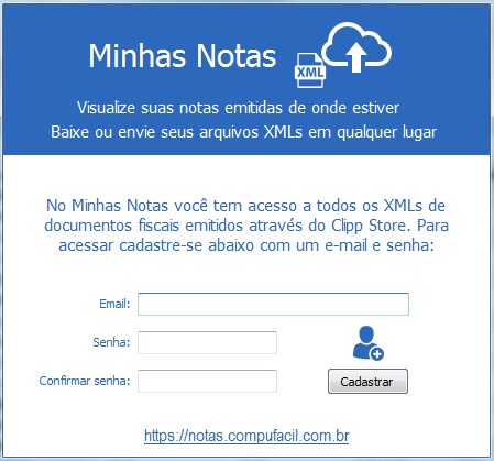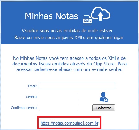 4 - Após concluir o cadastro, irá exibir a tela notificando que o cadastro foi efetuado com sucesso, nesta mesma tela poderá acessar o site responsável pelo armazenamento dos XMLs, basta clicar no endereço https://notas.compufacil.com.br.