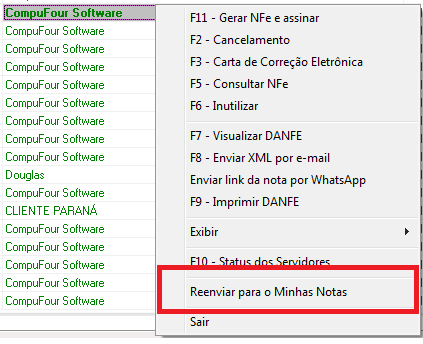 Caso alguma NFe ou NFC-e não tenha sido enviada para o minhas notas, você poderá reenviar, clicando com o botão direito nela e em seguida Reenviar para o minhas notas.