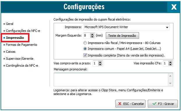 Para configurar a mensagem no Emissor de NFC-e de modo que sairá impresso em todas as vendas, basta abrir o emissor, pressionar a tecla F10 ou clicar no ícone