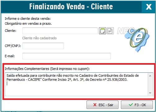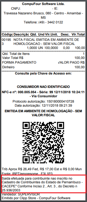 Para alguns clientes cadastrados para emissão de NFC-e no estado de Pernambuco, é necessário constar na impressão dos Cupons Eletrônicos (NFC-e) a seguinte informação:
