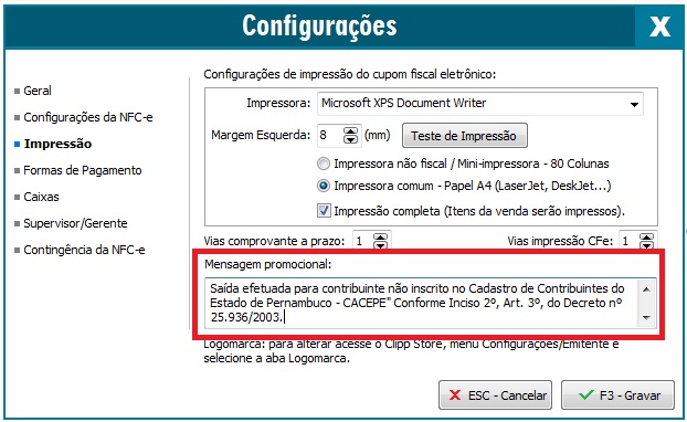 Imprimir informação obrigatória relativa ao CACEPE - PE na NFC-e no Clipp Pro