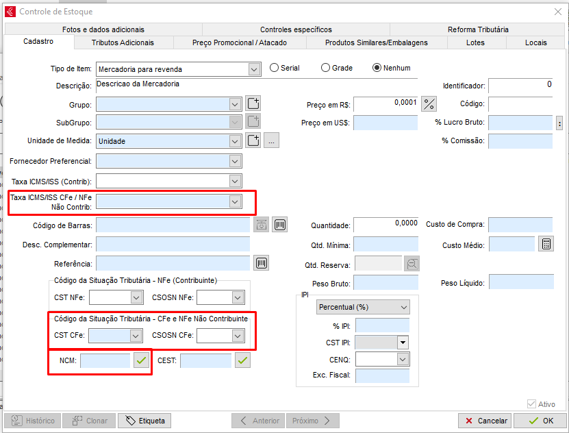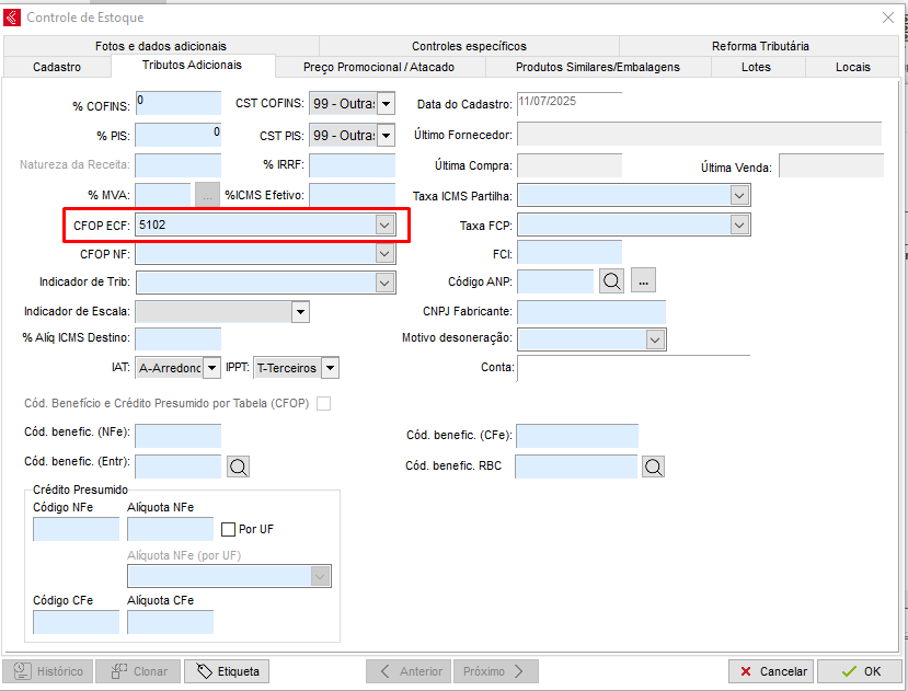 Ao migrar do ECF para NFC-e as alíquotas serão diferentes, deverá realizar a alteração no cadastro do estoque, para isso, abra o cadastro de estoque e altere a taxa do campo Taxa ICMS/CFe. Deverá conferir também o CST/CSOSn dos itens juntamente com o NCM que passará a ser validado, além do CFOP ECF na aba de Tributos Adicionais.