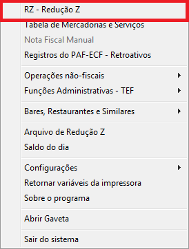 Para emitir a redução Z, abra o Emissor de Cupom Fiscal, pressione a tecla F10 ou clique em F10 - Supervisão e Clique na opção RZ - Redução Z