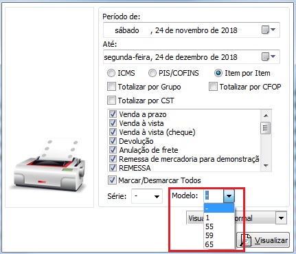 Para gerar o relatório das NFC-e, deverá selecionar o modelo 65, para gerar o relatório do SAT/MFe, selecione o modelo 59, já para as notas fiscais eletrônicas selecione o modelo 55, caso deixe sem preenchimento, irá gerar de todas as notas que você emite. Poderá deixar o campo Série em branco que o sistema irá gerar o relatório considerando todas as séries que foram emitidas, caso queira gerar apenas de uma série específica, selecione no campo série.