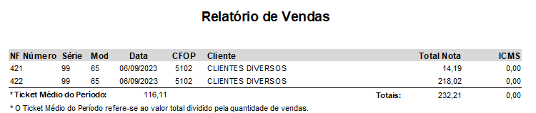 No relatório apresentará algumas informações sobre as vendas como, Número da NFe - Série - Modelo - CFOP - Cliente - Total da nota - ICMS.
