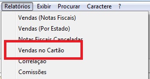 É possível também gerar o relatório de vendas no cartão, através do menu Relatórios - vendas no cartão: