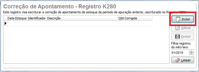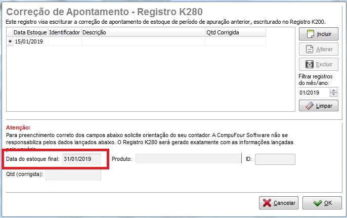 - Informe a data do estoque final, aqui deverá inserir a data de um mês anterior ao ajuste, para que aponte o bloco K280 no SPED.