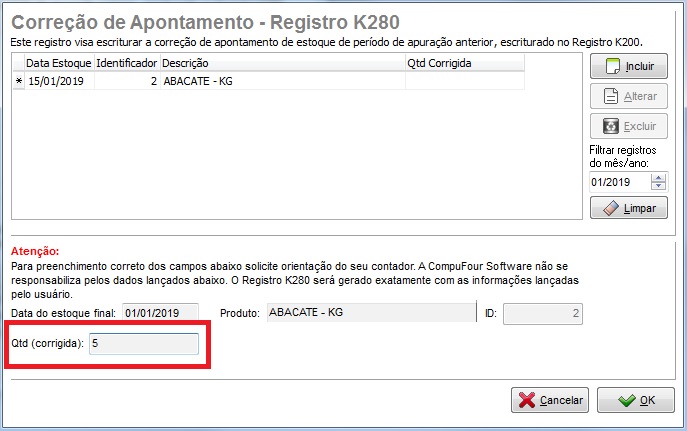 - Informe no campo Qtd (corrigida) a quantidade a ser corrigida deste item para informa-la no Bloco K.