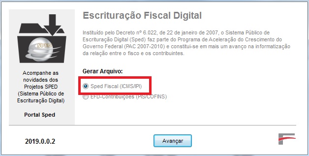 - Abrirá a tela para seleção do tipo de arquivo, marque a opção Sped Fiscal (ICMS/IPI) e clique em Avançar