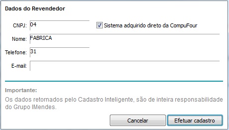 Automaticamente irá preencher os dados do emitente na tela de cadastro, poderá clicar em Efetuar cadastro e aguardar o contato do Grupo IMendes.