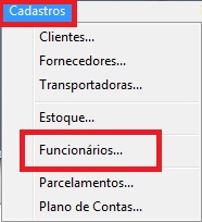 - Após abrir o sistema, clique em Cadastros e em seguida em Funcionários.