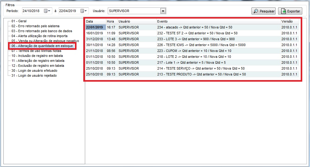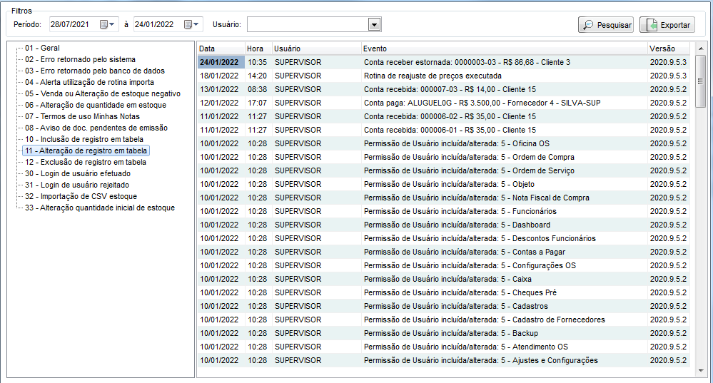 Os eventos de auditoria tem como finalidade demonstrar de forma clara cada alteração que o sistema sofreu por parte dos usuários; essa seção é acessada exclusivamente pelo Supervisor para poder ter um controle do que os demais usuários manipularam no sistema, irá apresentar em que horário ocorreu a alteração/situação, podendo ser filtrada por um intervalo de datas e exportada facilmente para HTML.