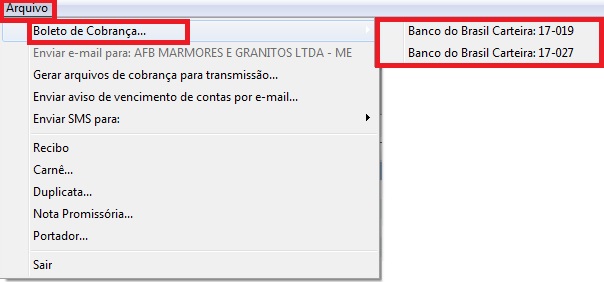 clique no menu Arquivo - Boleto de Cobrança e selecione a carteira (somente serão apresentadas as carteiras já configuradas):