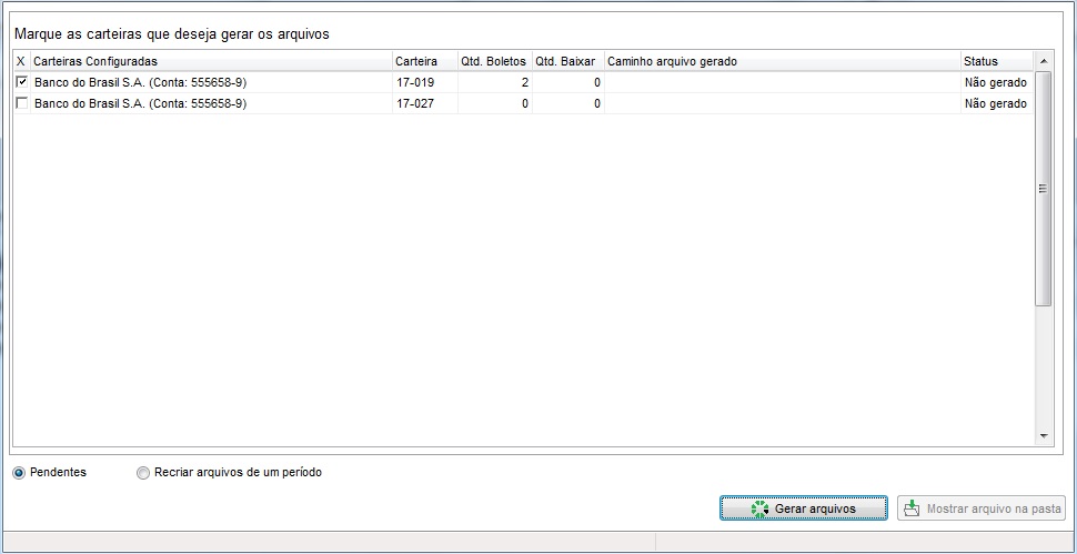 - Pendentes - Para gerar o arquivo de remessa referente a todos os boletos que ainda não foram gerados.
