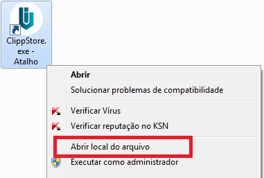 Opcionalmente poderá localizar os arquivos diretamente na pasta principal de instalação do sistema, para isso, minimize o Clipp Pro, clique com o botão direito do mouse no ícone dele e vá até a opção Abrir local do arquivo.