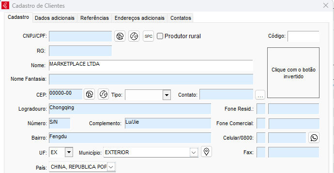 Caso um CT-e internacional for emitido, ou seja, para fora do país, as configurações do cadastro do cliente precisam ser feitas no seguinte formato.
