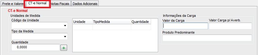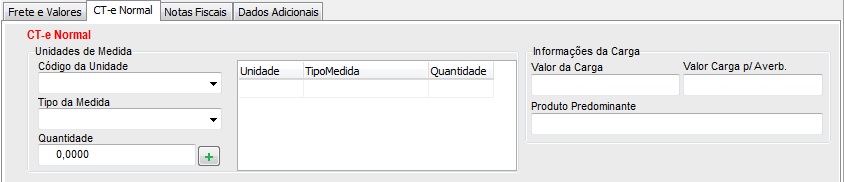 Clicando na guia CT-e Normal será possível incluir as Unidades de medida dos itens que irão ser transportados, além da quantidade e das informações da carga: