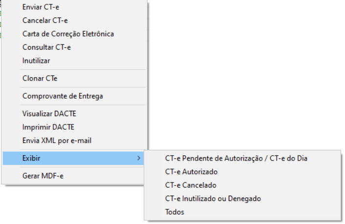 Clicando com o botão direito no CT-e serão apresentadas as seguintes opções: