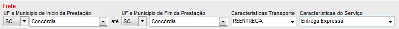 - Nesta guia, localizada no rodapé da tela, os campos: UF, Município de início e fim da prestação serão preenchidos de acordo com os dados do Remetente e Destinatário. Já os campos de Características de Transporte e do Serviço, podem ser selecionados conforme a listagem ou informados manualmente; caso informe manualmente, o mesmo será gravado e apresentado para os demais documentos a serem emitidos.