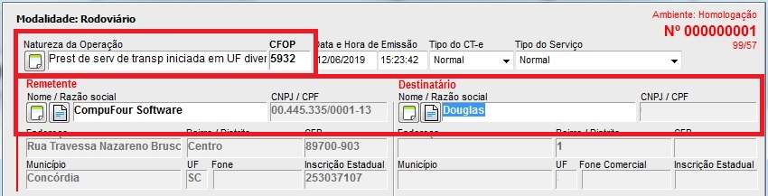 Informe a Natureza de Operação juntamente com os dados de Remetente e Destinatário.