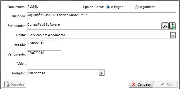 Ao receber a NF com as licenças do Clipp PRO, lance os valores no módulo de contas a pagar, para dar entrada nos valores do serviço adquirido.