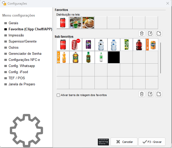 .Na guia de Favoritos/Subfavoritos é possível cadastrar os alimentos e bebidas vendidos, para facilitar o lançamento no momento do atendimento ao cliente, quando este for realizar seu pedido na mesa ou comanda. Marcando a opção Ativar barra de rolagem dos favoritos, será adicionada uma barra de rolagem no lançamento do favorito, para casos onde há muitos favoritos cadastrados.