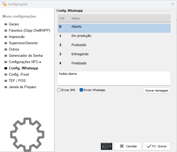 Aqui é possível configurar a mensagem padrão para enviar via whatsapp, a cada troca de status do Pedido, o sistema irá abrir uma caixa para envio de Whats ao cliente, marcando a opção Enviar SMS será enviado mensagem de texto SMS.