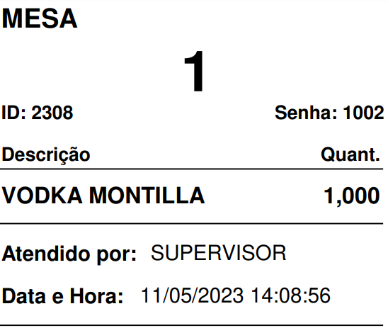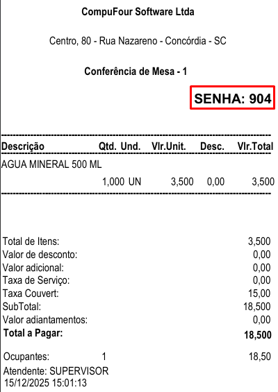 Quando for lançado uma MESA, COMANDA OU PEDIDO constará a senha impressa: