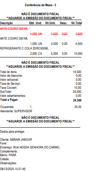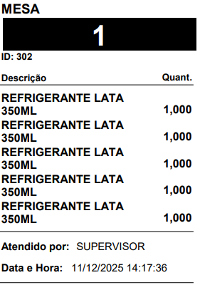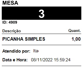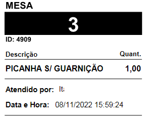 - Imprimir itens separados por ticket - O sistema vai gerar uma impressão para cada item da mesa, conforme exemplo: