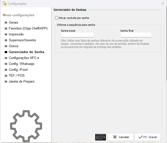 Na guia gerenciador de senhas é possível trabalhar com o controle de senhas, basta definir uma faixa (diferente da numeração utilizada em mesas).