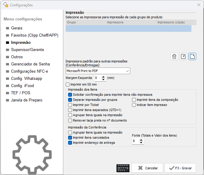 Após escolher os grupos e suas impressoras, clique no botão F3 - Gravar.