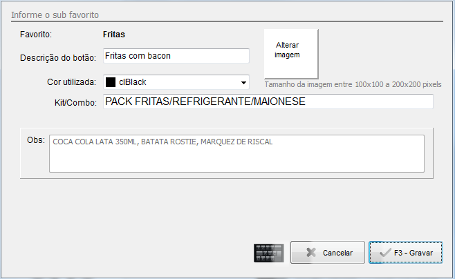 - Imagem na tela: Clicando no campo alterar imagem é possível cadastrar a imagem do Favorito, por exemplo, a imagem de uma porção de fritas, para simbolizar que este botão conterá esse alimento.