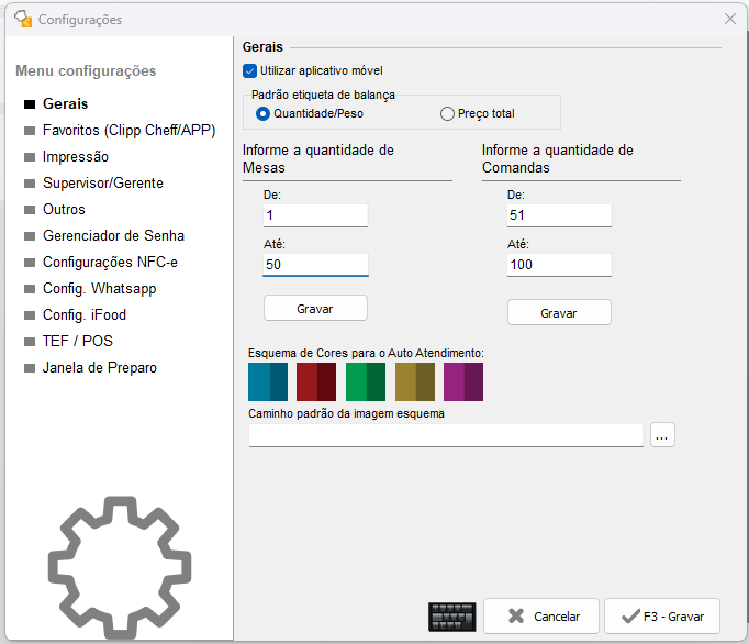 .Na aba Gerais é possível configurar a quantidade de mesas ou comandas que sua empresa utilizará, basta preencher nos campos de e até em sua respectiva ordem, preencha no campo mesas caso sua empresa trabalhe com esquema de mesas, ou no campo comandas, caso sua empresa trabalhe com esse tipo de organização.