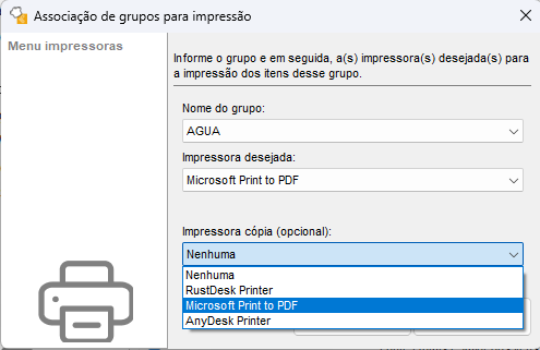 Caso queira imprimir um grupo de itens em 2 impressoras diferentes, defina a outra impressora no campo Impressora Cópia;